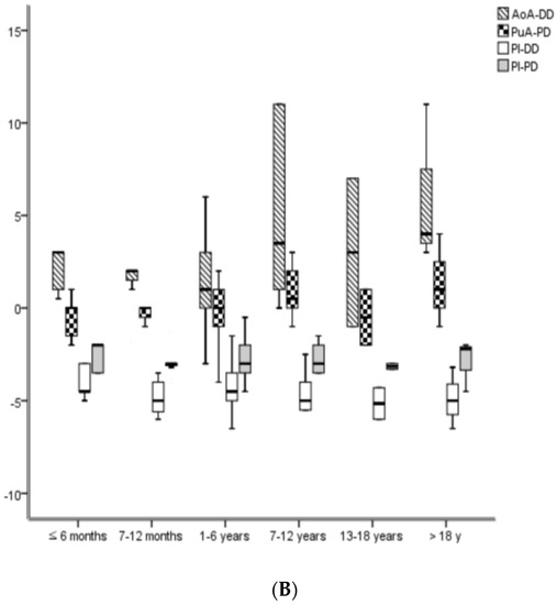 The changes in PDA sizes (A) and size gaps between PDA and NOC (B) according the chronological age groups. Ao, aorta; AoA, aortic ampulla of PDA; NOC, Nit-Occlud® coil; PDA, patent ductus arteriosus; PuA, pulmonary ampulla of PDA; PI, PDA isthmus; DD, distal diameter of NOC; PD, proximal diameter of NOC.