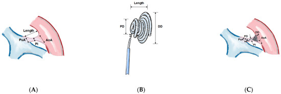 These novel formulae are feasible and understandable and can definitely help in selecting the NOC sizes in a stable manner according to the various sizes and morphologies of PDA. The size relationships between the regions of PDA and NOC are illustrated in Figure 2 and Figure 3.