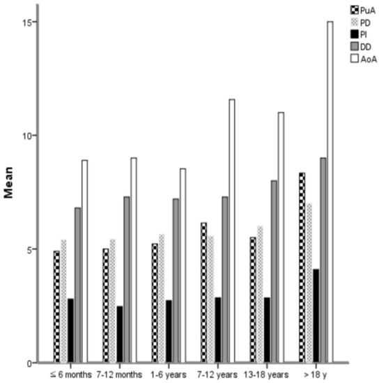 PuA (=PI + 3) = PD (=PI + 3) > PI < DD (= PI + 4) < AoA (=PI + 6) in children (the unit mm)