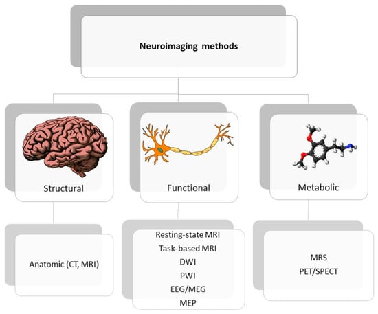 Classification of neuroimaging methods; CT—computer tomography, EEG—electroencephalography, MEP—motor evoked potential, MRI—magnetic resonance imaging, MRS—magnetic spectroscopy, PET/SPECT—positron emission tomography/ single photon emission computed tomography.