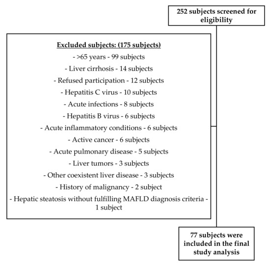 As demonstrated in Figure 1, a total of 252 subjects were screened for eligibility, out of which 175 subjects were excluded for the following reasons: 99 subjects were more than 65 years old, 14 subjects had liver cirrhosis, 12 subjects refused participation, 10 subjects presented hepatitis C virus, 8 subjects presented acute infections, 6 subjects presented hepatitis B virus, 6 subjects were diagnosed with acute inflammatory conditions, 6 subjects were active cancer patients, 5 subjects presented acute pulmonary disease, 3 subjects presented liver tumors, 3 subjects were diagnosed with other coexistent liver diseases, 2 subjects presented a history of malignancy, 1 subject diagnosed with hepatic steatosis in the control group. The final study analysis included a total of 77 Caucasian individuals. In Table 1, we summarize the participants’ general characteristics.