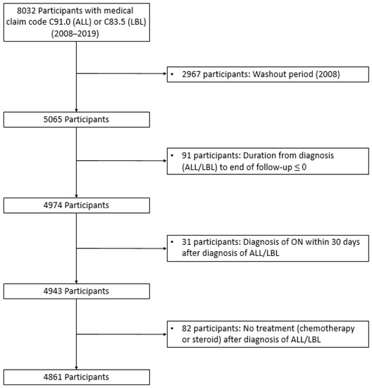 This study included individuals aged <40 years diagnosed with ALL/LBL between 2008 and 2019 (n = 8032). Patients with ALL and LBL were defined using ICD-10 codes C91 and C83.5, respectively, with codes for expanding benefit coverage (V-code in Korea). Policies to expand benefit coverage commenced in 2005 and have reduced medical expenses for catastrophic illnesses, including cancer and cardio-cerebrovascular diseases [41]. A 1-year washout period was applied to exclude prevalent cases (n = 2967) (Figure 1). The first ON diagnosis after ALL/LBL diagnosis was the event of interest. ON was defined using ICD-10 code, M87 or M90. Patients with ALL/LBL diagnosed with ON within 30 days after ALL/LBL diagnosis were excluded because they could have ON regardless of ALL/LBL treatment (n = 31). Moreover, we excluded 82 patients with ALL/LBL who did not receive anticancer therapy during the follow-up period. Finally, 4861 patients with ALL/LBL were identified from the database.