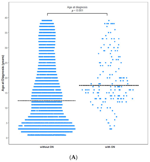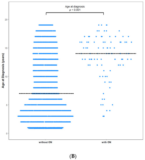 Age at diagnosis with and without ON among (A) total patients and (B) paediatric patients. (A) The mean age of patients without ON was 14.73 years, and that of patients with ON was 19.41 years (p < 0.0001). (B) The mean age of paediatric patients without ON was 8.20 years, and that of paediatric patients with ON was 13.28 years (p < 0.0001). Dashed horizontal lines reflect the median age at diagnosis of two groups.