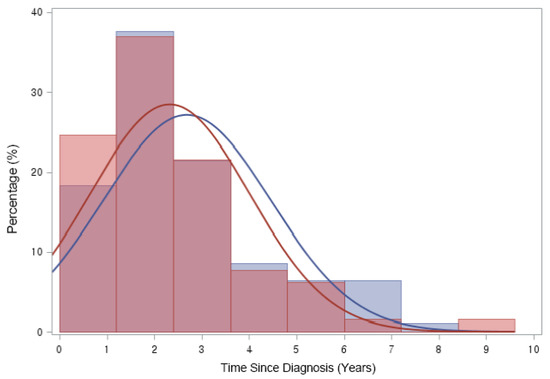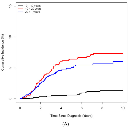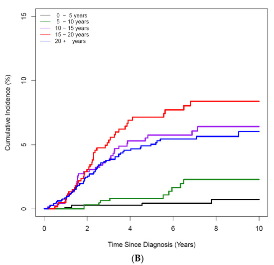 ON was diagnosed in 158 (3.25%) of 4861 patients with ALL/LBL, with 93 aged <20 years, i.e., 58.9% of all cases, and 65 patients aged ≥ 20 years. The mean age at ALL/LBL diagnosis was 19.41 years for patients who developed ON and 14.73 years for those who did not. In the paediatric group, the mean age at ALL/LBL diagnosis was 13.28 years for patients who developed ON and 8.20 years for those without ON (Figure 2). ON occurred more frequently in the young adult group than in the paediatric group (4.28% vs. 2.78%). However, the Cuml of ON at 10 years was the highest in patients aged 10–20 years (7.34%), especially in the age range of 15–20 years (8.38%) (Figure 3). The mean age at ON diagnosis was 22.0 ± 8.81 years, which is 2.54 ± 1.74 years after ALL/LBL diagnosis in all patients. Time from cancer treatment to ON diagnosis was similar in the paediatric (2.69 ± 1.77 years) and adult groups (2.33 ± 1.68 years) (p = 0.20). Approximately 90% of patients with ON were diagnosed within 5 years of the primary cancer (Figure 4).