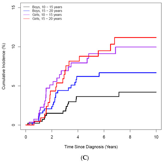 Cumulative incidence of ON according to age at the diagnosis of ALL/LBL in 4861 patients. (A) A 10-year scale, (B) 5-year scale (C) by age and sex. (A) During 10–20-years, the highest CI was noted, and during 15–20 years, patients had the highest CI (B). Girls showed higher CI than boys (C).