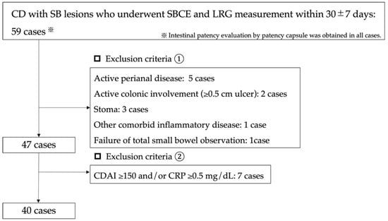 We retrospectively evaluated the cases of 59 patients with small bowel or small bowel colorectal-type CD attending who had undergone: (1) a patency evaluation with the use of a patency capsule, (2) small bowel capsule endoscopy (SBCE), and (3) LRG measurement during the period July 2020 to December 2021 at Tokyo Women’s Medical University. We then excluded the patients who had a CDAI ≥ 150, a CRP value ≥ 0.5 mg/dL, with an interval between their SBCE and LRG measurements of >30 ± 7 days, colorectal CD, active colorectal ulcerative lesions ≥ 0.5 cm, active perianal lesions, stoma, age < 18 years, failure of patency capsule assessment, or failure of total small bowel observation. A final total of 40 patients was included in the analysis (Figure 1).