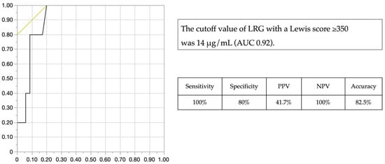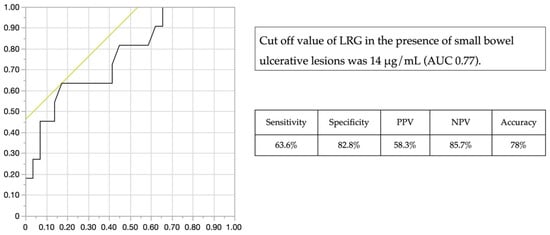 The LRG value with the highest area under the curve (AUC) was calculated from the ROC curves obtained in the presence and absence of small intestinal ulcerative lesions: LRG 14 μg/mL (AUC 0.77, Figure 2). The use of LRG 14 μg/mL to detect the presence of small intestinal ulcerative lesions showed 63.6% sensitivity, 82.8% specificity, 58.3% PPV, 85.7% NPV, and 78% accuracy.