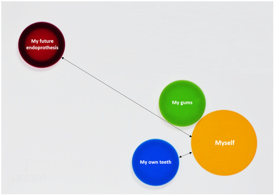 PRISM is a visual metaphor, which has been introduced to quantify suffering of patients [9]. Within this visual metaphor, the relationship between a fixed subject and different objects is displayed in a previously defined context. The context is represented by a white metal board (210 × 297 mm), whereby this context was “my life at the moment” in the current study. In the bottom right-hand corner of the board, a fixed yellow circle (7 cm in diameter) represents the Subject (“myself”). Differently colored magnetic disks with a diameter of 5 cm represent the Objects, reflecting oral health- and EP-related issues (see Figure 1 and Figure 2). In the current PRISM task, patients were instructed to place each Object disk on the board to reflect their perceived importance of their teeth, gums, and future EP. Moreover, the role of dental consultations was evaluated in this context. Within this task, patients reflected their perceived relationship between future EP and their oral health. As a quantitative output generated by PRISM, the distance between Subject and Object was measured. For part (I) of the current study, all patients received such a PRISM interview prior to their oral examination. For part (II), participants received either a PRISM task (Test) or a verbal briefing (Control). The verbal briefing was performed based on an information flyer of the clinic, which summarized the importance of oral conditions for the avoidance of infectious complications of EP. This briefing consisted of important information on the potential risk of oral disease-induced infectious complications of the EP. Thereby, the importance of healthy oral conditions, appropriate oral hygiene, and regular dental visits was explained. Both interventions, the PRISM task as well as flyer-based verbal briefing, lasted for approximately 10 min each (range 8–13 min).