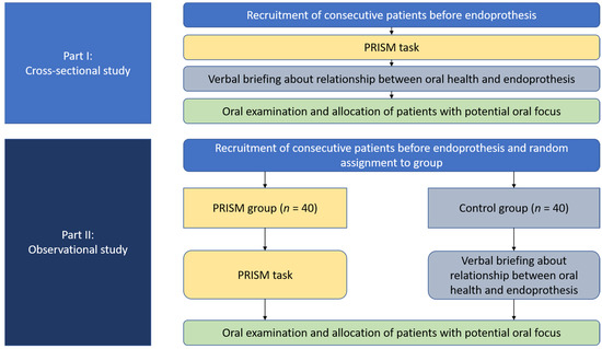 An overview on the whole study flow is displayed in Figure 3. For part (I), consecutive patients before EP implantation were recruited between September 2020 and April 2021. Those patients received a PRISM task, as described above. Furthermore, these patients underwent the whole oral examination and were informed about the importance of oral health for their future EP. Patients, who had a potential oral focus, were allocated to their dentist for therapy prior to EP implantation.