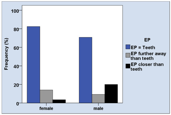 The distances between objects and subject on the PRISM board were small, with an average distance between 11.0 and 13.5 mm, depending on the question. The majority of patients, i.e., 76.2% perceived the same importance of EP and their teeth (Table 2). The distance between subject (“Myself”) and objects (oral health issues and EP) in the PRISM task was mainly not associated with age, gender, and oral conditions (Table 3). Male participants perceived the EP more often closer to the subject than female patients (Table 3, Figure 4, p = 0.02). The importance of healthy teeth rated in PRISM was associated with the number of teeth (p = 0.04, Table 3), which was not confirmed in post-hoc analysis.