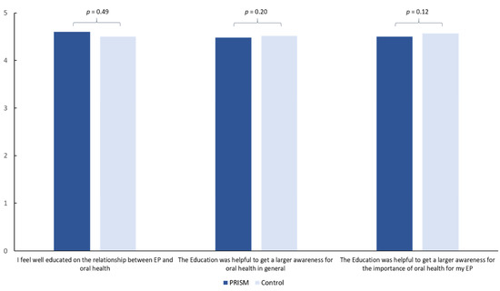Comparing the values between the evaluation before and after the PRISM task (Test) or the flyer-based verbal briefing (Control), several significant differences were found (Table 5). Both groups showed a significant increase in the questions: “I see a relationship between EP and teeth” (PRISM: 1.60 ± 1.86 vs. 4.20 ± 1.24, p < 0.01; Control: 1.33 ± 1.83 vs. 4.43 ± 1.24, p < 0.01), “I see a relationship between EP and gums” (PRISM: 1.50 ± 1.88 vs. 4.05 ± 1.41, p < 0.01; Control: 1.05 ± 1.75 vs. 4.43 ± 1.15, p < 0.01) and “I see a relationship between EP and dental consultations” (PRISM: 2.18 ± 2.22 vs. 4.18 ± 1.57, p < 0.01; Control: 1.85 ± 2.09 vs. 4.23 ± 1.37, p < 0.01). Only in the PRISM group, the perception of the future EP as a foreign body reduced after the PRISM task (1.35 ± 1.83 vs. 0.58 ± 1.26, p = 0.01). Both groups perceived a similarly high benefit of the PRISM task (Test group) or the verbal briefing (Control group) and felt well-educated after the intervention (Figure 5). Thereby, the average benefit was experienced around 4.5 points on a scale between 0 and 5, whereby 5 was set as the maximal possible benefit.
