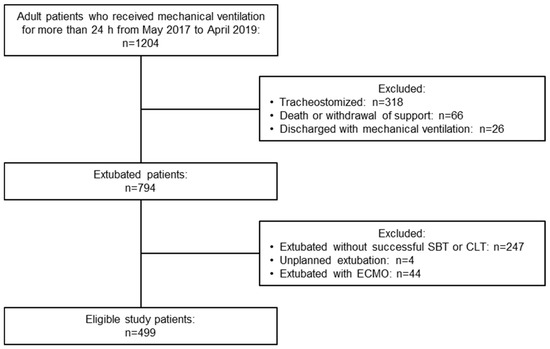 Flowchart of the study patients. SBT, spontaneous breathing trial; CLT, cuff leak test; ECMO, extracorporeal membrane oxygenation.