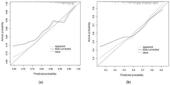 Calibration slopes for successful extubation (a) and uneventful extubation (b) based on the POSE model. The calibration slopes show the association between the actual probabilities of the events in the cohort (vertical axis) and the probabilities predicted by the POSE model (horizontal axis). We plotted the apparent line (Apparent) and the bias-corrected line (Bias-corrected). These lines indicated that the predicted probability does not deviate substantially from the actual probability of event occurrence. POSE, Prediction of Successful Extubation.