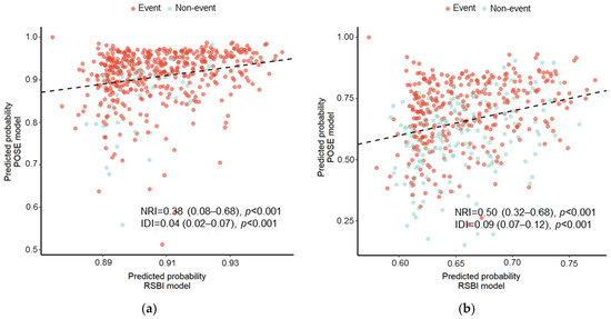 Predictive probabilities for successful extubation (a) and uneventful extubation (b). The inter-model differences between the novel prediction model based on eight predefined physiological factors (POSE model) and the conventional prediction model comprising RSBI alone (RSBI model) are demonstrated using NRI and IDI. Event indicates successful extubation (a) and uneventful extubation (b). The dashed line indicates the coincidence between the predicted probabilities of the POSE model (vertical axis) and the RSBI model (horizontal axis). The majority of patients with events fell above the dashed line, demonstrating that the POSE model predicts a higher probability of event occurrence than the RSBI model. POSE, Prediction of Successful Extubation; RSBI, rapid shallow breathing index; NRI, Net Reclassification Improvement; IDI, Integrated Discrimination Improvement.