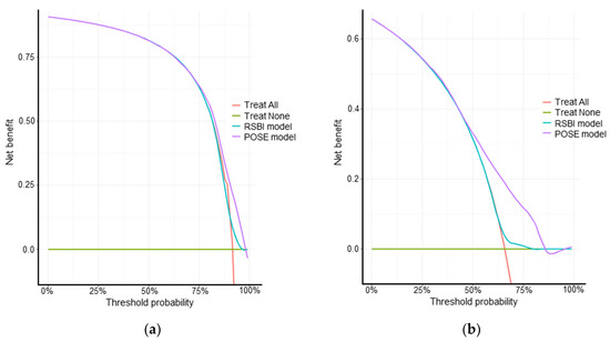 Decision curves for successful extubation (a) and uneventful extubation (b) predicted using each model. The decision curves show the net benefit for patients (vertical axis) when using each prediction model to make the decision regarding extubation at each threshold probability (horizontal axis). These results indicate that extubation decisions based on the POSE model may provide greater benefit than those based on the RSBI model, those based on the Treat-All approach (extubation for all patients), or those based on the Treat-None approach (no extubation). POSE, Prediction of Successful Extubation; RSBI, rapid shallow breathing index.