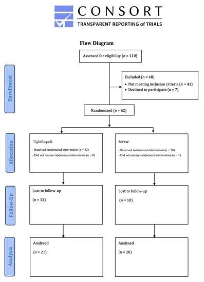 - Andersen, M.R.; Frihagen, F.; Hellund, J.C.; Madsen, J.E.; Figved, W. Randomized Trial Comparing Suture Button with Single Syndesmotic Screw for Syndesmosis Injury. J. Bone Joint Surg. Am. 2018, 100, 2–12. [Google Scholar] [CrossRef]