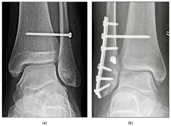 - Ray, R.; Koohnejad, N.; Clement, N.D.; Keenan, G.F. Ankle fractures with syndesmotic stabilisation are associated with a high rate of secondary osteoarthritis. Foot Ankle Surg. 2019, 25, 180–185. [Google Scholar] [CrossRef] [PubMed]