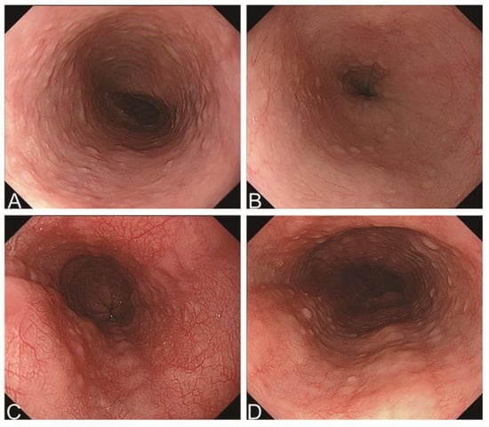 - Jiao, D.; Ishimura, N.; Maruyama, R.; Ishikawa, N.; Nagase, M.; Oshima, N.; Aimi, M.; Okimoto, E.; Mikami, H.; Izumi, D.; et al. Similarities and differences among eosinophilic esophagitis, proton-pump inhibitor-responsive esophageal eosinophilia, and reflux esophagitis: Comparisons of clinical, endoscopic, and histopathological findings in Japanese patients. J. Gastroenterol. 2017, 52, 203–210. [Google Scholar] [CrossRef]