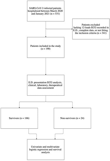 Therefore, this study aims to describe the prevalence and type of electrocardiographic alterations at emergency department (E.D.) arrival in subsequently hospitalized SARS-CoV-2-infected patients and to investigate the possible association between ECG parameters and 28-day mortality after adjusting for variables, including age, sex, comorbidities, and laboratory findings that could influence the endpoint.