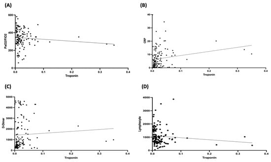 Correlation analyses between troponin values and PaO2/FiO2 (Panel A), CRP (Panel B), D-dimer (Panel C), and lymphocyte count (Panel D) at hospital admission. CRP, C-reactive protein (expressed as mg/dL). D-dimer, troponin, and lymphocyte count are expressed as ng/mL, μg/L, and lymphocytes/μL, respectively.