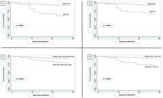 Estimated 28-day survival probability after hospital admission for patients with and without AF rhythm detection on ED presentation (A), on ED presentation and with in-hospital onset (B), right ventricular strain (C), and prolonged QTc interval (D). ED, emergency department; AF, atrial fibrillation.