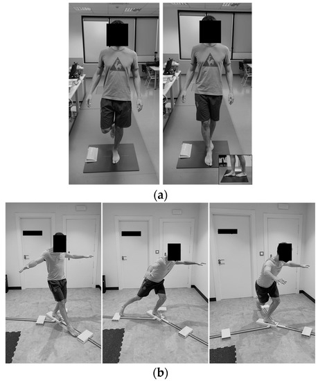 (a) Posturographic assessment of static balance (from left to right): unipodal support position, tandem position; (b) assessment of the dynamic balance (left limb support, from left to right): Y-Balance test anterior direction, Y-Balance test posteromedial, Y-Balance test posterolateral.
