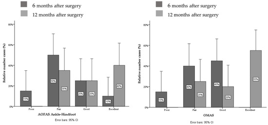 Participants showed significant improvement in scores in both AOFASAH (∆ = +10.8 points, g = 0.8) and OMAS (∆ = +22.6 points, g = 0.9) questionnaires comparing 6 months to 12 months after surgery assessments (Table 2). Based on the AOFASAH at 6 months after surgery, 50% of the patients showed fair results and only 10% showed excellent results. According to the OMAS at 6 months after surgery, 40% of the patients showed fair results and 45% showed good results. At 12 months after surgery, only 40% of the patients showed excellent results in the AOFASAH and 55% in the OMAS (Figure 4).