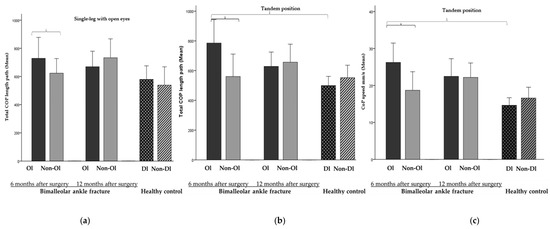 Static balance results (from left to right): Ol: Operated limb; Non-Ol: Non-operated limb; Dl: dominant liimb; Non-Dl: Non-dominant limb. (a) Single-stance and (b) tandem position: >total centre of pressure (CoP) length path and (c) tandem position: >CoP speed in operated limb compared to non-operated limb at 6 months after surgery in people with bimalleolar ankle fracture (−0.3 ≤ g ≤ −0.7, respectively); (b,c) tandem position: (b) total CoP length path and (c) CoP speed in operated limb of people with bimalleolar ankle fracture compared to dominant limb of healthy control at 6 months after surgery (g = −0.8 and g = −0.8, respectively). Error bars: 95%.