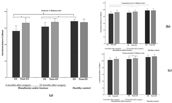 Y-Balance test at 6- and 12-month assessments after surgery in participants with bimalleolar ankle fractures compared to healthy control.