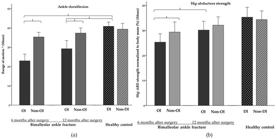 Ol: operated limb; Non-Ol: Non-operated limb; Dl: dominant limb; Non-Dl: Non-dominant limb. (a) Ankle dorsal flexion ROM. Range of dorsal flexion of the operated limb at 6 and 12 months after surgery in people with bimalleolar ankle fracture compared with non-operated limb and with the dominant limb of the healthy control (−0.8 ≤ g ≤ −2.5). (b) Hip abductor strength of the operated limb at 6 months after surgery in people with bimalleolar ankle fracture compared with non-operated limb and with the dominant limb of the healthy control (−0.5 ≤ g ≤ −1.2). Error bars: 95% CI.