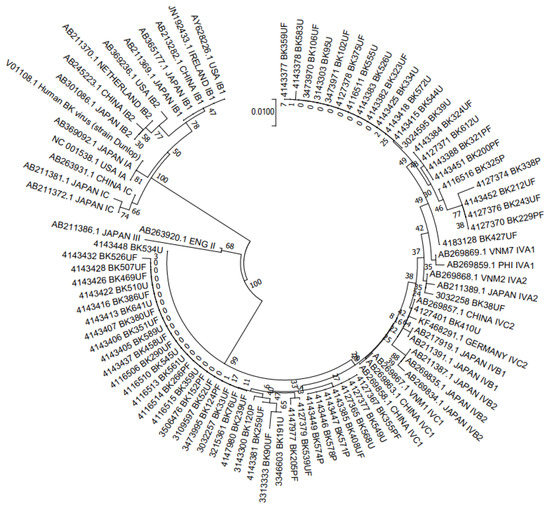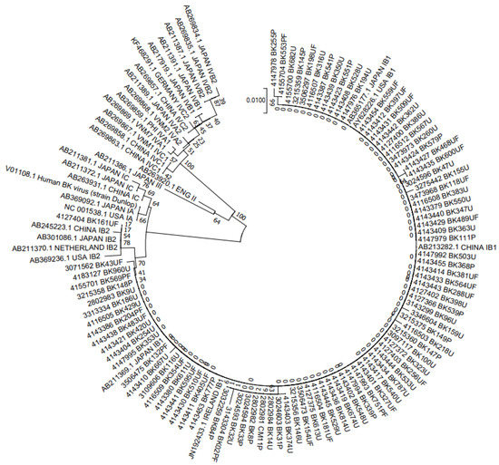 The first genotyping scheme for BKV was reported by Jin et al. in 1993 using restriction fragment-length polymorphism (RFLP) based on nucleotide polymorphisms in a very short fragment of the gene of the capsid protein VP1 (nucleotides 1744 to 1812). Sanger sequencing is now a major method of genotyping BKV [19]. In previous studies, the phylogenetic tree was constructed based on a complete genome sequence or any viral genomic region; however, the VP1 gene region contains more polymorphism information that can yield a clearer definition of subgroups [6,20].