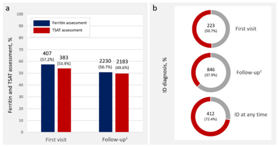 Number and proportion of patients with ID assessment and ID diagnosis: (a) Ferritin and TSAT assessment; (b) ID diagnosis. 1 Person visits. ID: iron deficiency; TSAT: transferrin saturation.