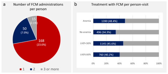 Treatment with FCM. (a) Number of FCM administrations of iron per person during the follow-up period; (b) rates of FCM administration per person visits, depending on the presence of anemia and among LVEF subgroups. FCM: ferric carboxymaltose; LVEF: left ventricle ejection fraction.