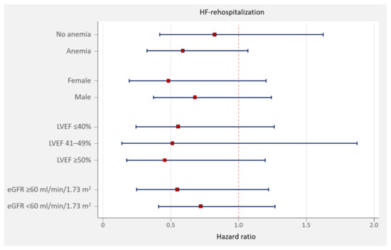 Subgroup analysis. Units for eGFR values are mL/min/1.73 m2. Error bars represent 95% confidence intervals. eGFR: estimated glomerular filtration rate; HF: heart failure; LVEF: left ventricle ejection fraction.