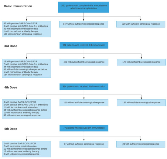 At our institution, basic immunization against SARS-CoV-2 was performed with two doses of one of the following vaccines in different combinations—BNT162b2 (Comirnaty, BioNTech/Pfizer, Mainz, Germany), mRNA-1273 (Spikevax, Moderna Biotech, Madrid, Spain), ChAdOx1-S (AZD1222, AstraZeneca, Södertälje, Sweden), or Ad26.COV2.S (Johnson & Johnson, Janssen, Beerse, Belgium). Sustained non-responders received up to five doses of SARS-CoV-2 vaccines. A detailed institutional protocol is provided in Item S1 and Figure S1. All patients provided written and informed consent into off-label use for vaccine doses four and five. For the current analysis, we included adult kidney transplant recipients who received SARS-CoV-2 vaccinations from 27 December 2020, until 31 December 2021. Serological response to vaccination, demographic data, transplantation data, and medication, as well as routine laboratory data, were analyzed retrospectively. The ethics committee of Charité—Universitätsmedizin Berlin approved this study (EA1/030/22).
