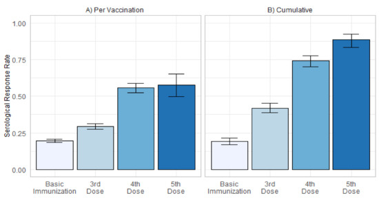 (A) Serological response rate (±standard deviation) per vaccination after basic immunization, three, four, and five doses of SARS-CoV-2 vaccines in kidney transplant recipients without sufficient serological response before the latest vaccination. (B) Cumulative serological response rate (±95% confidence interval) after up to five doses of SARS-CoV-2 vaccines in all kidney transplant recipients with at least one vaccination meeting the inclusion and exclusion criteria.