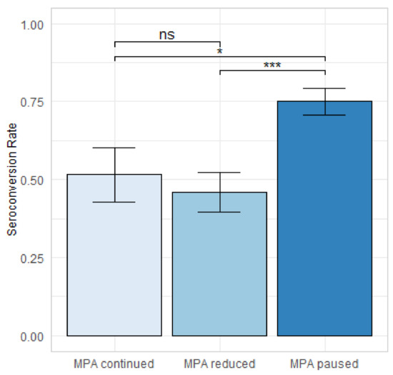 The serological response rate in the paused MPA group was 75%, which was significantly higher than in the reduced MPA group (46%, adjusted p < 0.001) and the steady MPA group (52%, adjusted p = 0.02) (Figure 3), with no significant difference between the latter two groups (adjusted p = 0.61).