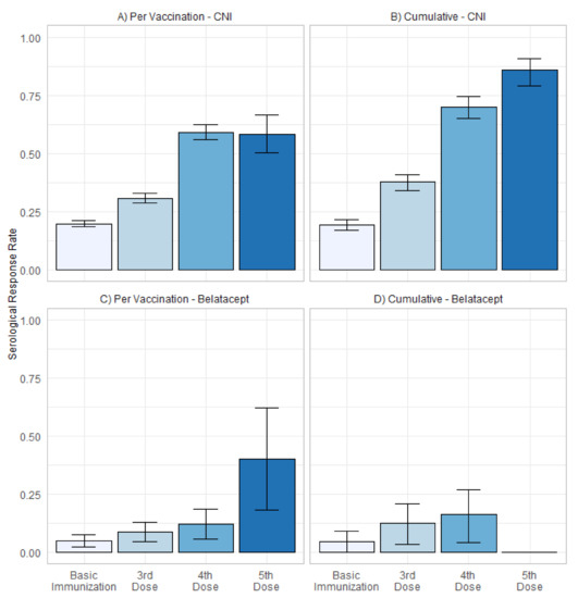 (A) Serological response rate per vaccination (±standard deviation) and (B) cumulative serological response rate (± 95% confidence interval) after up to 5 vaccinations in patients with CNI-based immunosuppression, as well as (C) serological response rate per vaccination (±standard deviation) and (D) cumulative serological response rate (±95% confidence interval) after up to 4 vaccinations in patients with belatacept-based immunosuppression. Cumulative response rate after fifth vaccination is not shown for patients with belatacept, due to low patient count of 5 patients receiving fifth vaccination.