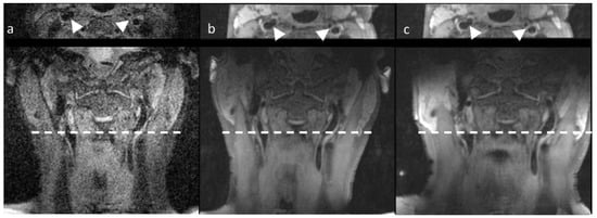3D T1-weighted SPACE transversal and coronal views acquired with the three configurations of the carotid bifurcation. The upper panel shows transversal images, while the lower panels show coronal images. (a) No surface coil, (b) MRI-only coil, and (c) PET/MRI coil. White arrows in the transversal images indicate the left and right carotid arteries.
