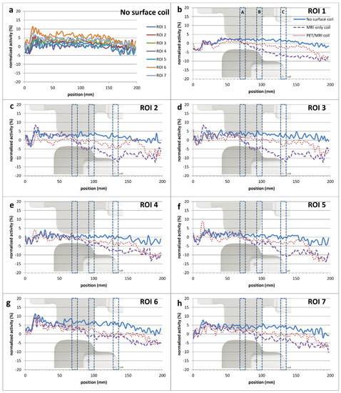 The normalized activity throughout the phantom for each of the ROIs. The approximate position of the PET/MRI coil (top) and MRI-only coil (bottom) can be seen in the background. (a) The variation in the no surface coil configuration activity in the seven ROIs. (b–h) The normalized activities of the no surface coil configuration as well as with the PET/MRI and MRI-only coil. The highest deviation from the no surface coil configuration for each ROI is seen in the region of the electronic housing. In all ROIs the PET/MRI coil shows less deviation from the no surface coil configuration as compared to the MRI-only coil.
