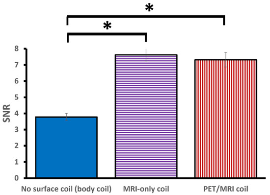 Mean SNR values for the three configurations. The error bars represent the standard error. PET/MRI and MRI-only showed significantly higher SNR values as compared to the configuration without a surface coil. No significant difference in SNR was observed between PET/MRI and MRI-only coils. The asterisks ("*”) indicate a significant difference in SNR (p < 0.05).