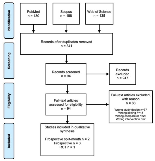A total of 453 studies were imported into the Covidence Platform from the PubMed, Scopus, Web of Science databases. After removing 112 duplicates, a total of 341 articles were screened title and abstract, 247 studies were found to be irrelevant as they were not fitting with aims of our study, 94 studies were identified for full-text assessment, and only 6 articles [10,16,17,18,19,20] met all required inclusion characteristics at the end of the full text analysis. A brief description of the selection process, as well as the reasons for the exclusion of articles during the full-text assessment is shown in a flow diagram, according to the PRISMA statement (Figure 1).