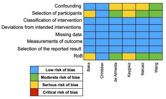 The RoB results is presented in Figure 2. Overall, the RCT from Chhibber and coworkers [17] was the only one with low RoB. On the other hand, three studies had moderate RoB [10,18,20], and two studies presented serious RoB [16,19]. The RoB analysis is shown in Figure 2.