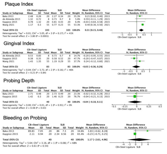 The meta-analysis of Yang and coworkers [11] aimed to compare SLBs and CBs and whether they can promote oral health and relieve discomfort. The authors found out that SLBs are not superior to CBs in promoting oral health and supreme discomfort. The statistical analysis for the PI parameter showed that passive SLBs and CBs did not differ significantly (WMD 0.04, 95% CI (0.30,0.22), p = 0.07). Verrusio et al. [27] published a systematic review on the effects of orthodontic treatment of periodontal inflammation. They mentioned that fixed orthodontic therapy may increase periodontal inflammation during and after treatment. In addition, the authors indicate that accumulation and composition of subgingival microbiota may increase periodontal inflammation, which results in higher BoP scores (no statistical analysis was available).
