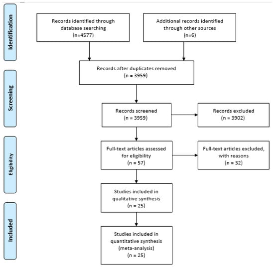 The literature search initially retrieved 4577 published studies and 6 articles from a secondary search for the years 1995 to 2020. Of these, 629 were excluded as duplicates, 3901 after reading the title and abstract, and 32 after reading the whole article (Supplementary Table S2). Therefore, 25 articles met the selection criteria (Figure 1). Only two included articles used ACR criteria and did not include Chapel Hill criteria have been selected for evaluation independently of GPA or EGPA. All of the studies included in the analysis were observational, most were retrospective, 20 were based on hospital registries, 1 used national surveys, 1 used a national database, 1 combined primary care and hospital databases and data registry from the National Social Security System, and 2 used hospital and primary care registries.