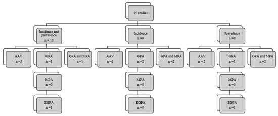 Of the 25 studies included, 10 evaluated both incidence and prevalence, 9 only assessed incidence, and 6 only prevalence. Figure 2 shows the types of AAV analyzed in the studies of incidence and/or prevalence, with most evaluating all types of AAV.