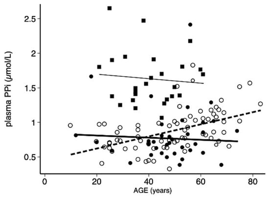 A recent study of a pediatric cohort of 200 children who underwent blood testing for medical conditions not affecting plasma PPi levels revealed no significant difference between genders and only a decreasing trend (not statistically significant) between age 0 to 18 [19]. To our knowledge, the only reported increase in PPi levels with age was in the urine of ABCC6−/− mice [20]. In addition, we found in our cohort age-dependent and gender differences in plasma Pi, as previously observed in the general population [21,22], but there was no significant difference in the PPi/Pi ratio.
