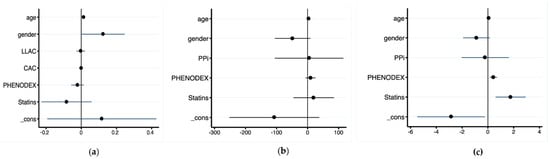 Coefficient plots from multivariable stepwise regression models with PPi (a), CAC (b) and LLAC (c) as dependent variables.