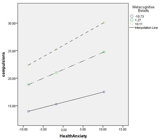 Figure 2 showed the graphic presentation of moderation analysis where steep lines indicated that the high level of metacognition beliefs strengthened the positive relationship between health anxiety and compulsions.