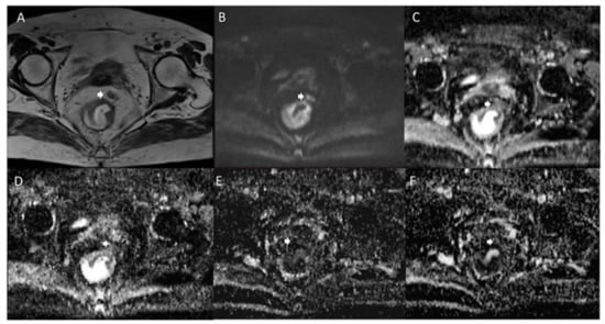 Although the role of DWI in the assessment of RC is controversial, it has been proven useful for the evaluation of EMVI [75]. However, there is no consensus between the American and European guidelines: the first recommends the use of DWI both in primary staging and in restaging since DWI improves the detection of small lesions, the latter recommends DWI evaluation only in the restaging [16,17].